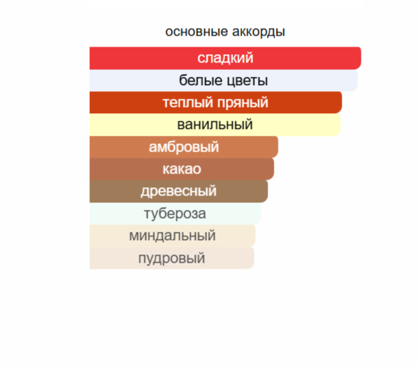 Верхние ноты: Миндаль, Кофе, Бергамот и Лимон; средние ноты: Тубероза, Жасмин Самбак, Цветок апельсина, Болгарская роза и Корень ириса; базовые ноты: Бобы тонка, Какао, Ваниль, Пралине, Сандал, Мускус, Амбра, Кашемировое дерево, Пачули, Корица и Кедр. Пол : Женский