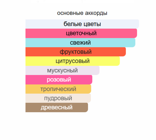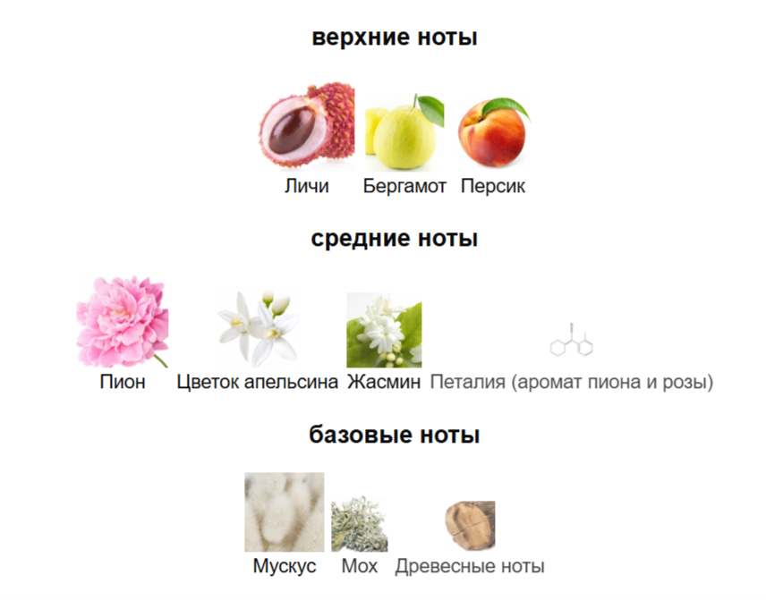 Верхние ноты: Личи, Бергамот и Персик; средние ноты: Пион, Цветок апельсина, Жасмин и Петалия (аромат пиона и розы); базовые ноты: Мускус, Мох и Древесные ноты. Пол : Унисекс