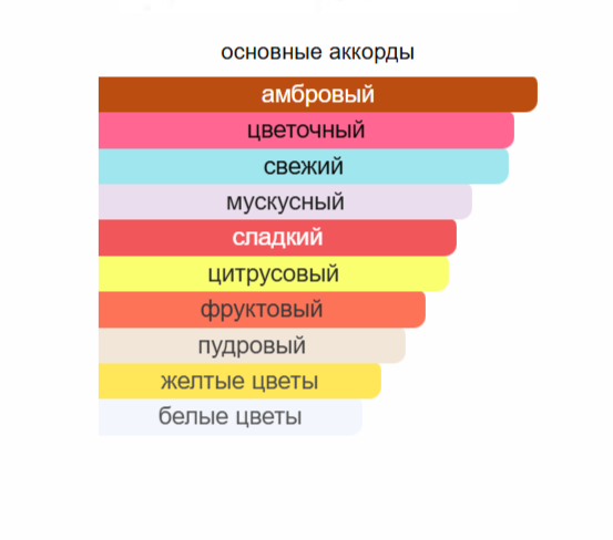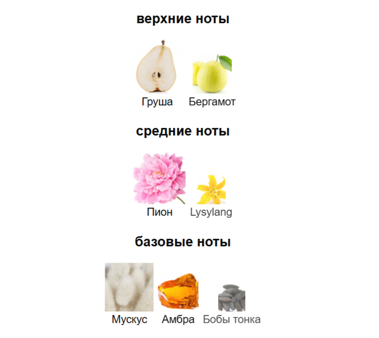 Верхние ноты: Груша и Бергамот; средние ноты: Пион и Lysylang; базовые ноты: Мускус, Амбра и Бобы тонка. Пол : Унисекс