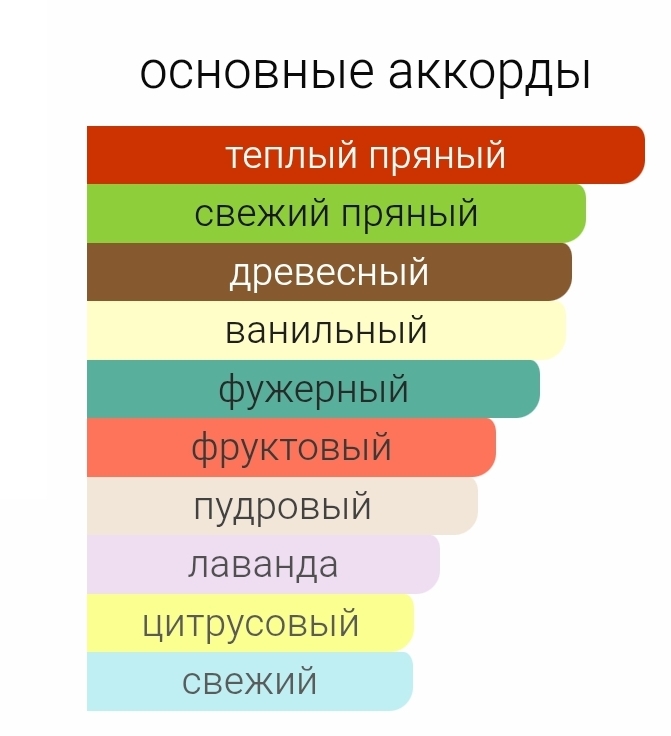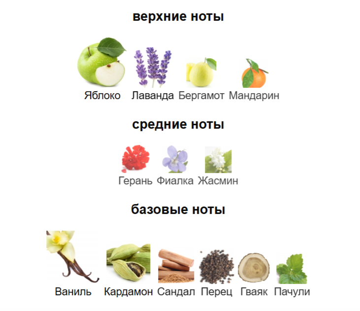 Верхние ноты: Яблоко, Лаванда, Бергамот и Мандарин; средние ноты: Герань, Фиалка и Жасмин; базовые ноты: Ваниль, Кардамон, Сандал, Перец, Гваяк и Пачули.
