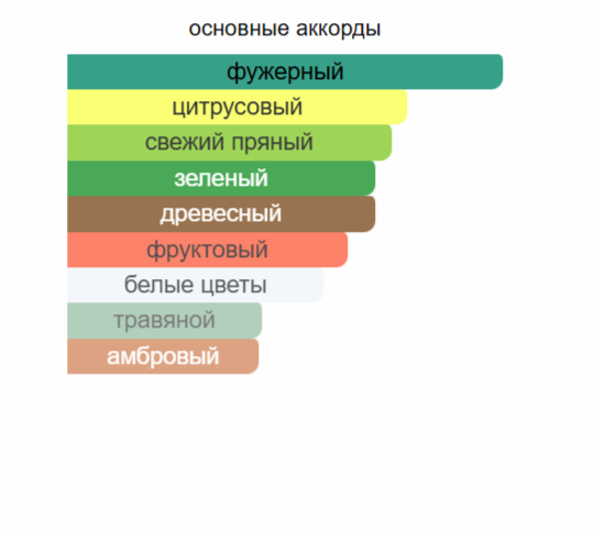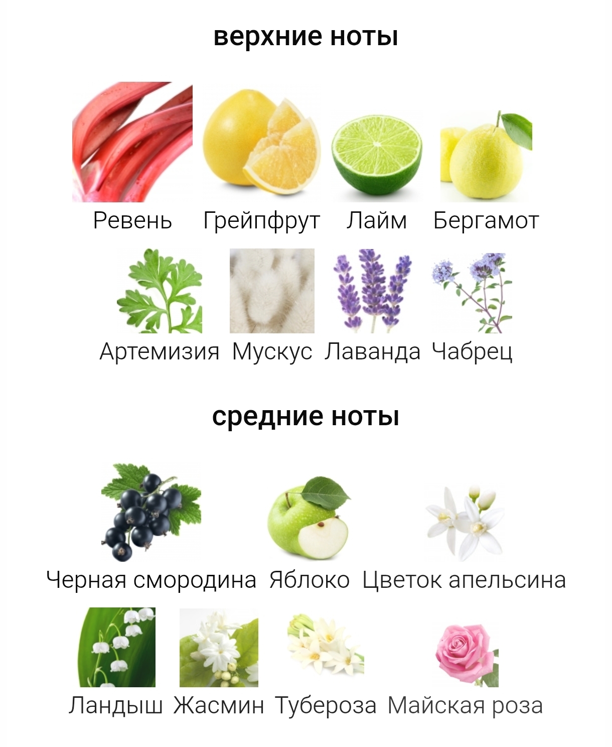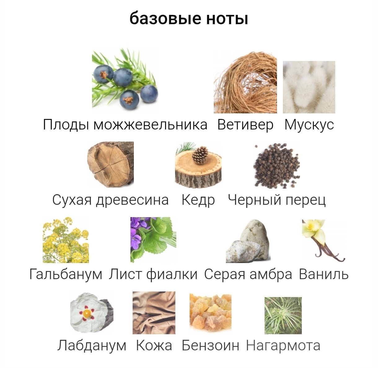 Верхние ноты: Ревень, Грейпфрут, Лайм, Бергамот, Мускус, Артемизия, Лаванда и Чабрец; средние ноты: Черная смородина, Яблоко, Цветок апельсина, Ландыш, Жасмин, Тубероза и Майская роза; базовые ноты: Плоды можжевельника, Ветивер, Мускус, Сухая древесина, Кедр, Черный перец, Гальбанум, Лист фиалки, Серая амбра, Ваниль, Лабданум, Кожа, Бензоин и Нагармота.