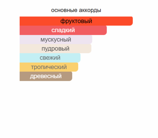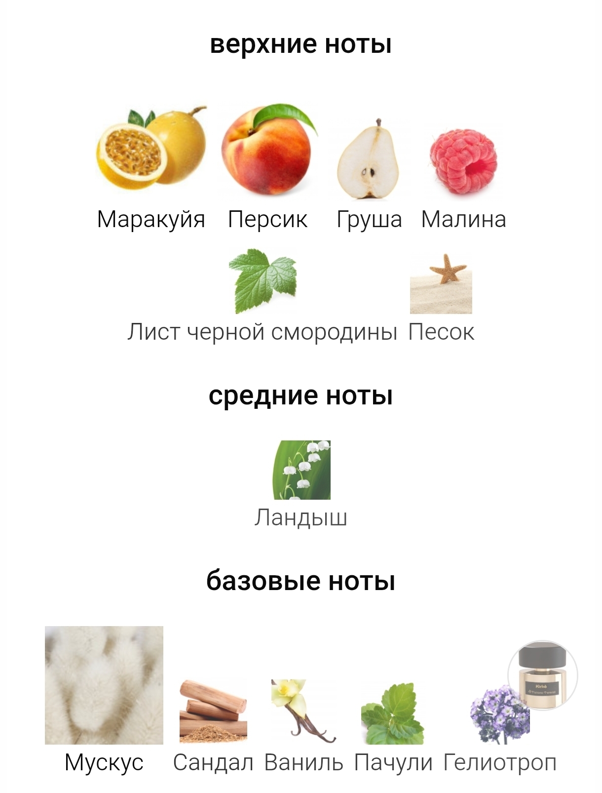 Верхние ноты: Маракуйя, Персик, Груша, Малина, Лист черной смородины и Песок; средняя нота: Ландыш; базовые ноты: Мускус, Сандал, Ваниль, Пачули и Гелиотроп.