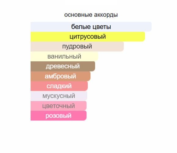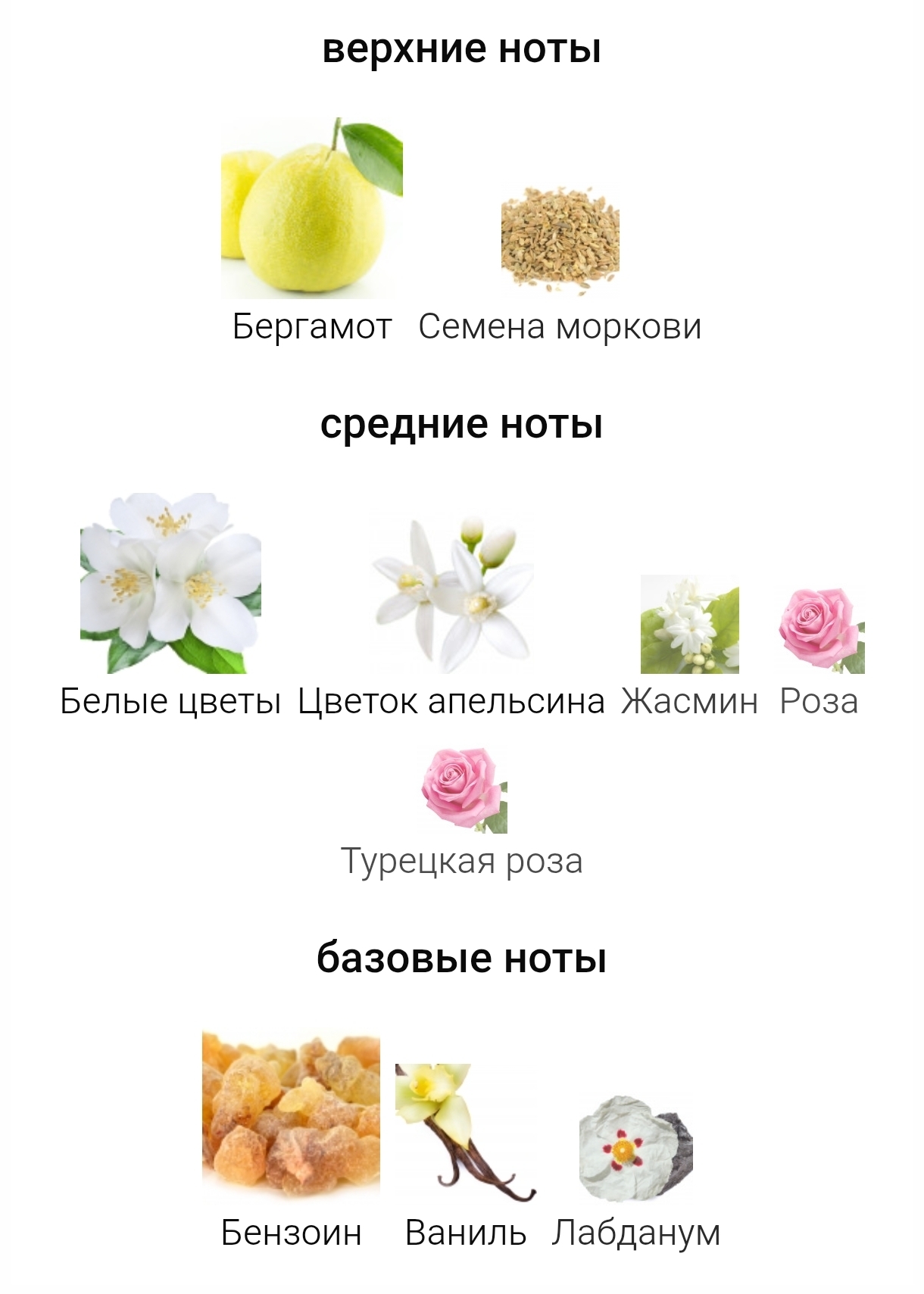 Верхние ноты: Семена моркови, Бергамот и Мандарин; средние ноты: Жасмин, Цветок апельсина и Турецкая роза; базовые ноты: Ваниль, Древесные ноты и Амбра.
