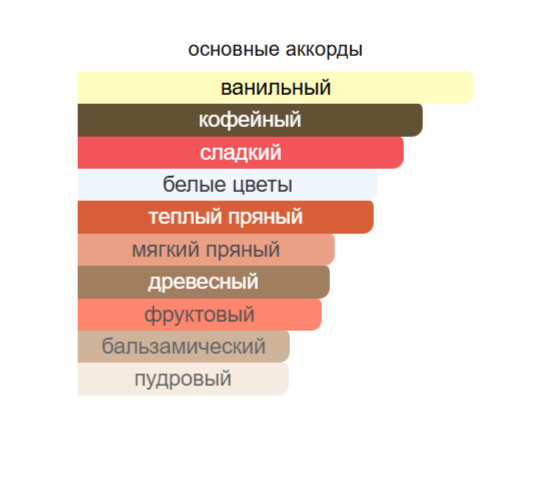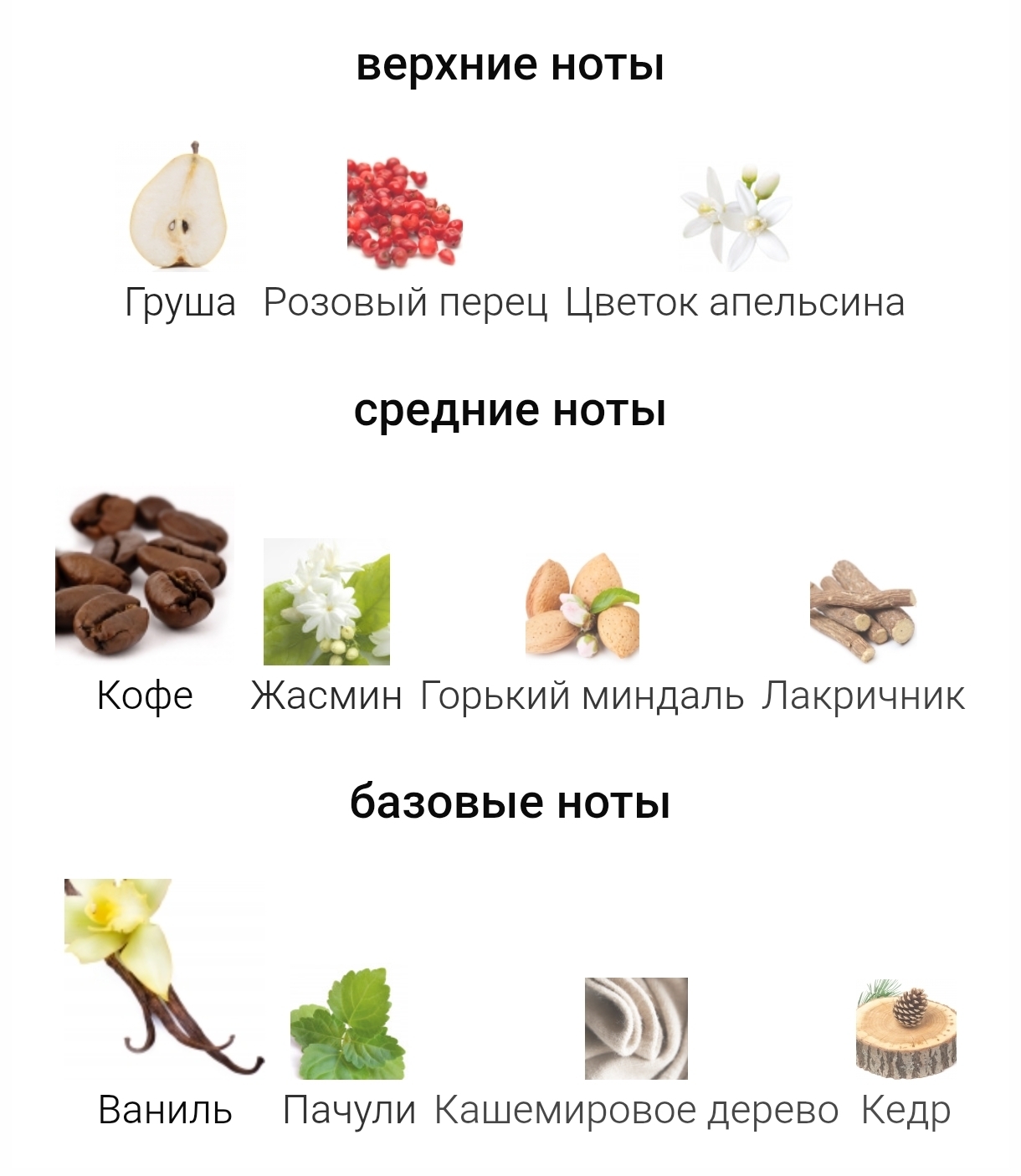 Верхние ноты: Груша, Розовый перец и Цветок апельсина; средние ноты: Кофе, Жасмин, Горький миндаль и Лакричник; базовые ноты: Ваниль, Пачули, Кашемировое дерево и Кедр.