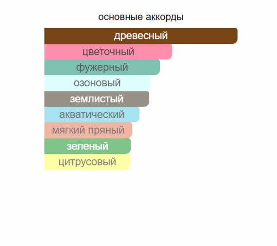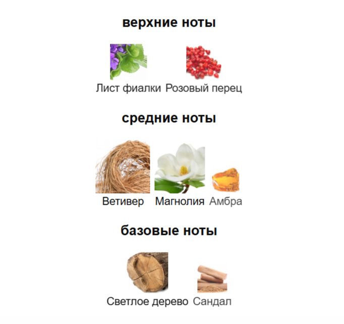 Верхние ноты: Лист фиалки и Розовый перец; средние ноты: Ветивер, Магнолия и Амбра; базовые ноты: Светлое дерево и Сандал.