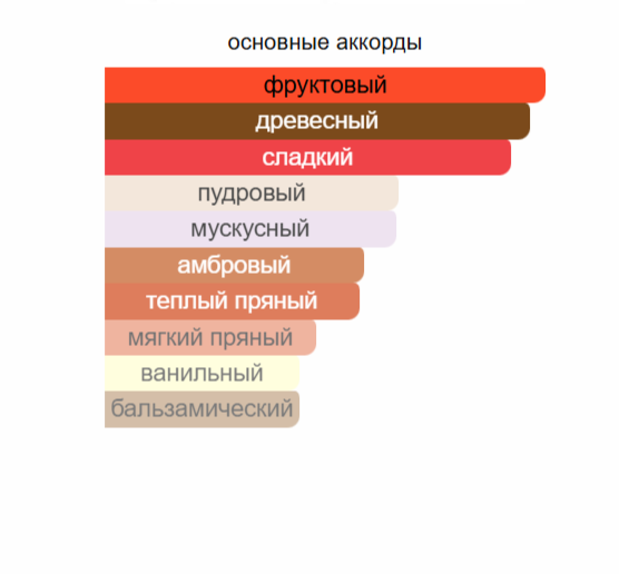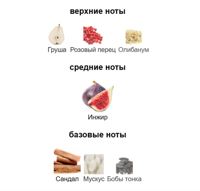 Верхние ноты: Груша, Розовый перец и Олибанум; средняя нота: Инжир; базовые ноты: Сандал, Мускус и Бобы тонка.