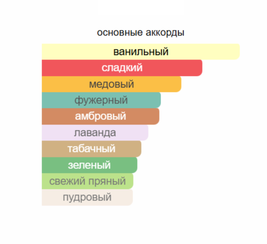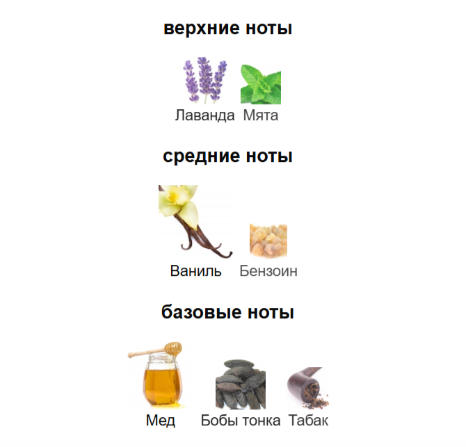 Верхние ноты: Лаванда и Мята; средние ноты: Ваниль и Бензоин; базовые ноты: Мед, Бобы тонка и Табак.