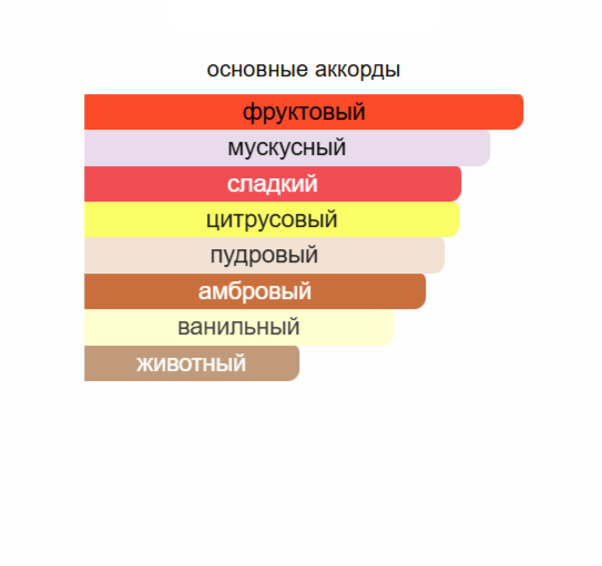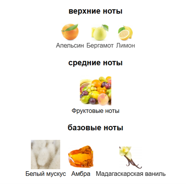 Верхние ноты: Апельсин, Бергамот и Лимон; средняя нота: Фруктовые ноты; базовые ноты: Белый мускус, Амбра и Мадагаскарская ваниль.