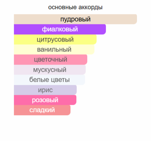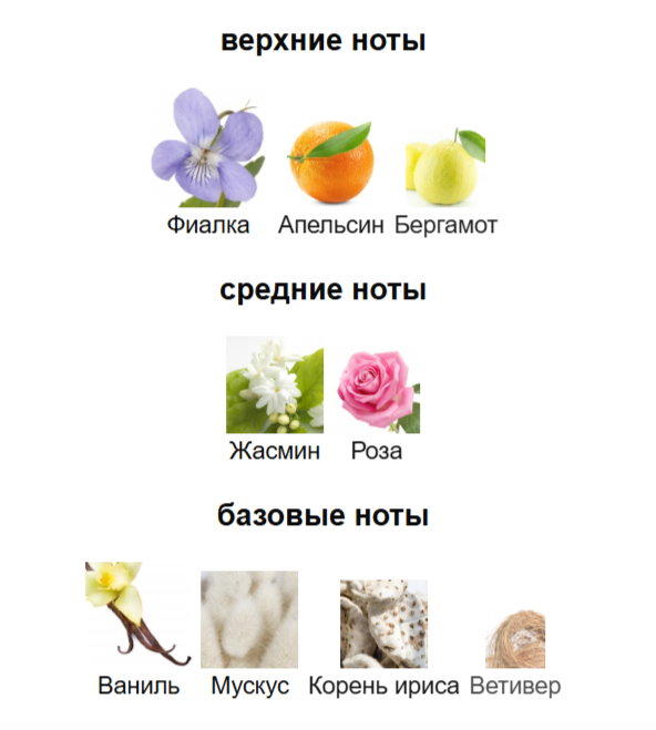 Верхние ноты: Фиалка, Апельсин и Бергамот; средние ноты: Жасмин и Роза; базовые ноты: Ваниль, Мускус, Корень ириса и Ветивер.
